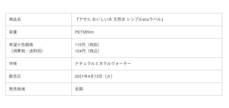 『アサヒ おいしい水 天然水 シンプルecoラベル』は、2020年の識別表示に関する制度変更に伴い、従来の「アサヒ おいしい水」で採用していたロールラベルに替えて、必要表示内容が記載された小面積のタックシール(シンプルecoラベル)を片面に貼付することで、ラベルに使用するCO2の排出量約58%削減※されたのに加え、店頭での単品販売が可能になりました。
