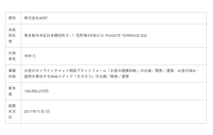 株式会社400F(https://400f.jp)は、2017年11月に設立、2020年7月にMBOを経て株式会社お金のデザインから独立し事業運営を開始しました。2018年11月に、お金のオンラインチャット相談プラットフォーム「お金の健康診断」を、2019年11月には、お金の悩み・疑問を解決するWebメディア「オカネコ」を正式リリースするなど、人々の生活と資産に関わる諸問題を解決する製品の企画・開発・運営などを行っています。
