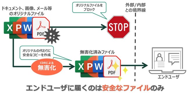 ReSecは、メールやWeb、USBメディアなどの外部から持ち込まれるファイルを無害化し、ランサムウェアなどのマルウェアを除去するソリューション(開発元:ReSec Technologies 社、イスラエル、以下ReSec社)です。ゼロトラストのコンセプトに則り、外部から送られてきたオリジナルファイルをそのまま組織の内部に取り込むのではなく、レプリカファイルを作成しファイルに含まれる危険な部分を除去した(CDR技術)うえで、組織内のユーザに提供します。PPAP回避の際のセキュリティ対策としても有効です。海外をはじめ、国内でも大手金融系企業からも実績があり、特にレプリカファイル生成の再現性の高さを評価いただいています。
