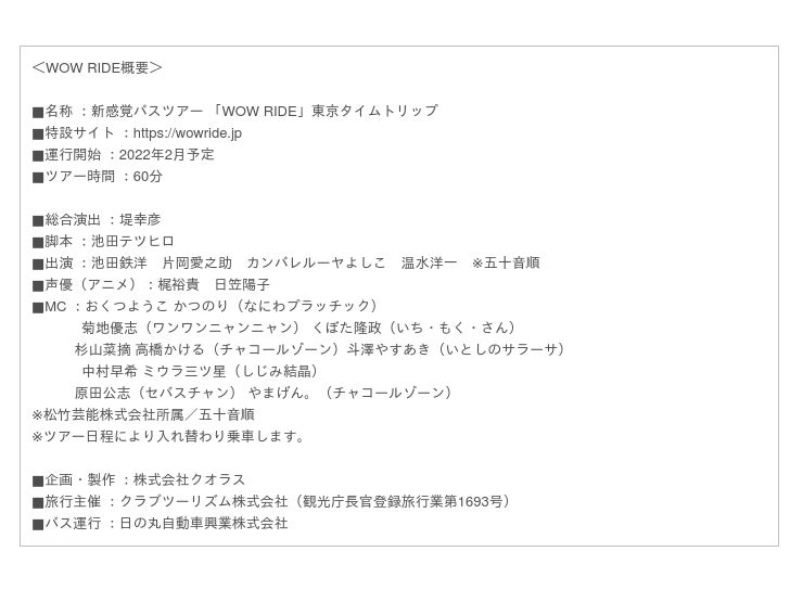 KNT-CTホールディングス株式会社(本社:東京都新宿区 社長:米田 昭正、以下、KNT-CT)およびグループ傘下のクラブツーリズム株式会社(本社:東京都新宿区 / 代表取締役社長:酒井博、以下クラブツーリズム)とフジ・メディア・ホールディングスの総合広告会社、株式会社クオラス(本社:東京都品川区 / 代表取締役社長:松下幸生、以下クオラス)は、世界初のテクノロジーと日本が誇るエンターテインメントを駆使し、現実世界と仮想世界のバーチャルツアーを実現した都市観光バスツアー「WOW RIDE」(ワゥ ライド)を製作、2022年2月にツアーを開始します。