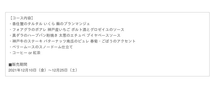 “食”を通じて地元の魅力を発信したいという思いから、この冬も地元神戸の食材を使った料理がお楽しみいただける贅沢なクリスマスコースをご用意いたしました。