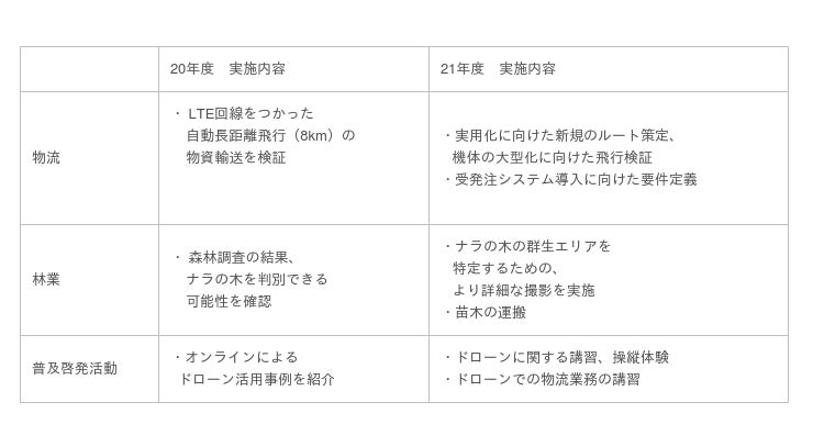 ドローンの物流実証実験については2019年度より岩泉町地区にて取組んでおり自治体主体による地域実装実現に向けた支援を行っております。