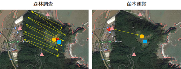 小本地区内における森林調査と苗木運搬の飛行ルート