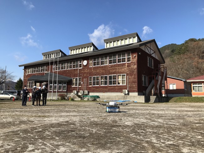 また、子どもたちにもドローンを目にする機会を提供するため、講習会は地域の小学校体育館で実施し、1)の実証実験におけるドローンの発着は、小学校の校庭で行いました。