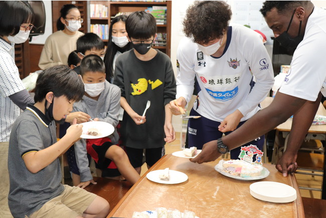 沖縄市の学習支援ひろば「くじら寺子屋」にて行われた贈呈式には、琉球ゴールデンキングスの#2小寺ハミルトンゲイリー選手と#34小野寺祥太選手が参加し、子ども達へ直接アイスケーキをお渡ししました。