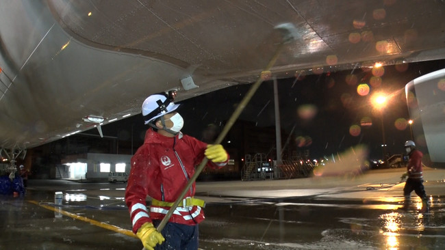 深夜23時の羽田空港。機体を洗浄する「洗機場」で待ち構えていたのは13人の作業員たち。こちらの現場を仕切り、年間100機以上の洗浄を手掛ける野村陽介さんが所属するJALグランドサービスは、飛行機を誘導する「マーシャラー」やお客さんの荷物などを運搬するカーゴ業務などを請け負う会社。空港で「縁の下の力持ち」として働くスペシャリスト集団です。今回洗浄するのは、最新のエアバスA350。全長66.8m、全幅64.75mの大きな機体をどのように洗うのでしょう?使用するのは長さ2~3mの棒の先にスポンジを装着した道具。器用に動かしながら入念に汚れを落としていきます。13人が総力を上げて3時間。ようやく機体洗浄が完了しました。