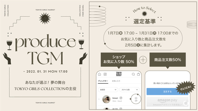 2022年3月21日(月・祝)開催予定の『第34回 マイナビ 東京ガールズコレクション 2022 SPRING/SUMMER』の舞台に立つ2名のディレクターを、TGM会員の応援投票で決める「Produce TGM」を開催中!TGM会員は、応援したいディレクターのショップを「お気に入り登録」および、ショップで「お買い物」することで応援投票をすることができ、見事1位2位に輝いたディレクターがTGCへの出演権を獲得します。