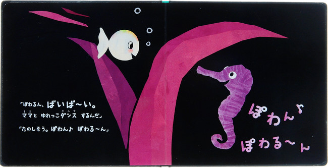 おさかなちゃんのくらす海は、読む人の心の中にある、想像の海。水の色は黒で表されています。最初のページでは、海の底からあがってくるカラフルな泡に、こどもはきゃっきゃっ。