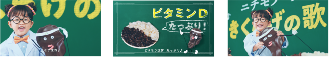 新CMでは、ののかちゃんが先生役になりきって『きくらげの歌』を披露。共演したオリジナルキャラクター・きくらげの「きく蔵」と、「ぷるぷるきくらげのヒミツはね♪」と、きくらげのヒミツを歌い上げます。ののかちゃんの可愛らしい歌声にのせて、ビタミンDがたっぷり取れるきくらげの魅力を伝えます。