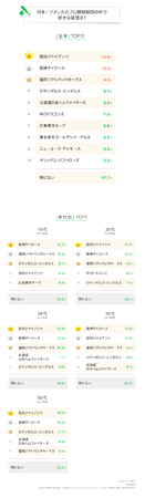年代別にみると、20~50代では「読売ジャイアンツ」「阪神タイガース」がTOP2となっていますが、10代では1位が「阪神タイガース」、2位が「福岡ソフトバンクホークス」となり、3位に「ロサンゼルス・エンゼルス」となりました。「読売ジャイアンツ」は僅差で4位にランクインとなりました。