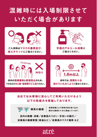 アトレでは、お客様ならびに従業員の健康と安全に配慮し、新型コロナウイルス感染防止対策として以下の取組みを実施しております。