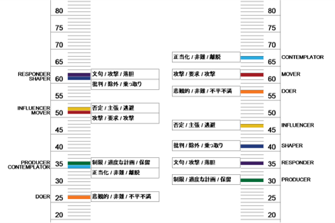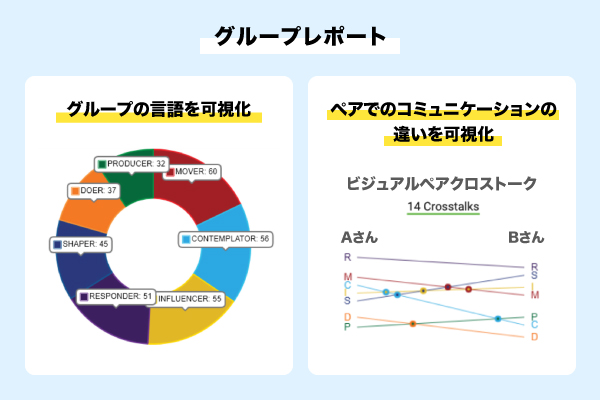 一見同じ会話・言動であっても、タイプによって受ける心理的影響や求める反応・返事の内容が異なり、ストレスの感じやすさも変化します。選択式の質問にWEB上で回答するだけで、そのタイプの度合いと各割合を数値化。さらに、ペアやグループで診断すると、出来事や人間関係、ストレスや価値観などに対する、お互いの相性にどれくらい違いがあるか表やグラフで可視化することを実現しました。この画期的な特長が評価され、現在はアメリカやイギリス、ドイツ、北欧などを中心に世界108か国以上で導入されています。