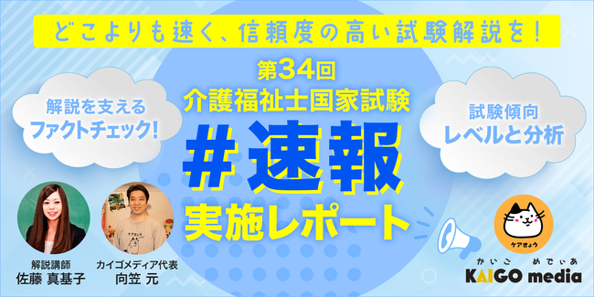 介護領域に特化した動画・SNSメディアを運営する株式会社カイゴメディア(本社:東京都渋谷区、代表取締役:向笠 元、以下カイゴメディア)では、令和4年1月30日に行われた第34回介護福祉士国家試験の解説速報を試験当日にライブ配信いたしました。現場実務と長年の指導経験豊富な講師を迎え、受験者から届いた解説希望に基づき、約2時間強に渡り「日本の介護」を浮き彫りにする試験内容の解説を行いました。