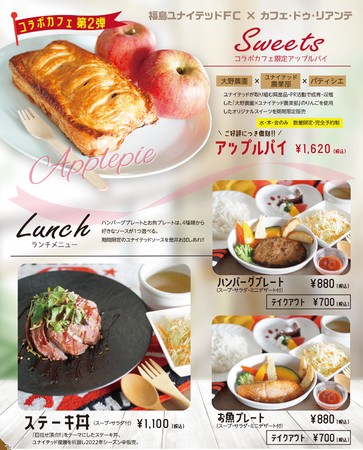 今年も、クラブが取り組む県産品PR活動で成育・収穫した「大野農園×福島ユナイテッドFC農業部」のりんごを使用した『アップルパイ』や『りんごジュース』の販売のほか、コラボランチとして、大人気ハンバーグランチ・お魚ランチに福島ユナイテッドFCをイメージして考案されたオリジナル「ユナイテッドソース」が期間限定で選べます。