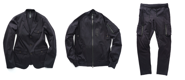 薄くて軽く、動きやすい。40ゲージのハイゲージダブルニットで編み上げられた生地は滑らかで肌当たりが柔らかく、高密度だから叶うフラットで美しい表面感とハイパワー4WAYストレッチが特徴。撥水機能もある。適度なストレッチが体の動きになじむテキスタイル。パワーストレッチのハリ感のあるニット生地がとても着心地がよく、普段使いに加えて、リモートワークやジム・ゴルフへの行き帰りに大変重宝します。