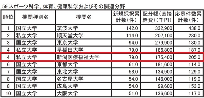 2022年1月に文部科学省が発表した「令和3年度(2021年度)科学研究費採択件数(過去4年間の新規採択の累計数)」において、「スポーツ科学、体育、健康科学、およびその関連分野(リハビリテーション科学を含む)」で、本学は全国第4位となりました(私立大学では第2位)。