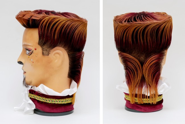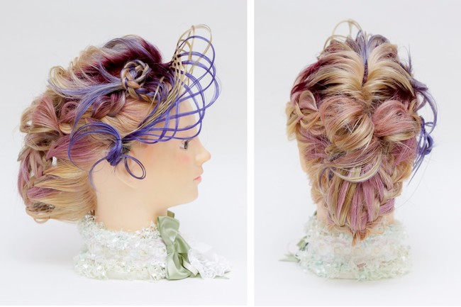 フリースタイル部門では、出場者が指示をして作製したウィッグを、カットウィッグ(マネキン)に取り付け、制限時間1時間でカットやスタイリングを行います。それぞれが予め設定したテーマに沿って、毛材の長さや量、色の組み合わせなど全て自由なスタイルで競いました。今年は本部門の歴代優勝者が複数名出場するなど、熾烈を極めた戦いになりました。作品は「ウィッグではできない」というイメージのあるアップスタイル、毛の流れ・ボリュームを左右上方向に流した動きのある作品が揃いました。