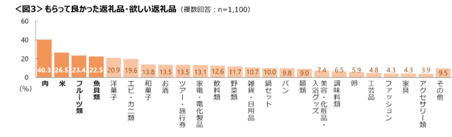 返礼品でもらって良かったもの・欲しいものは「肉」がトップ。「米」、「フルーツ類」、「魚貝類」も人気。<図3>