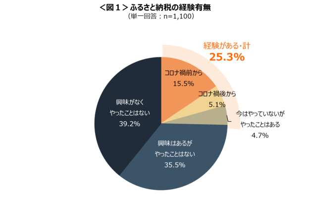 ふるさと納税の経験を聴取したところ、経験がある人は25.3%と、4人に1人は経験があるという結果になった。興味はあるがやったことはない人は35.5%。<図1>