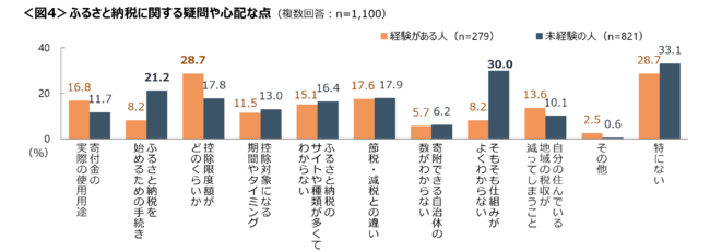 ふるさと納税の経験がある人では、「控除限度額がどのくらいか」が気になることとしてあがる。 未経験の人では、「始めるための手続き」や「そもそもの仕組み」がわかっていない人も多い。<図4>
