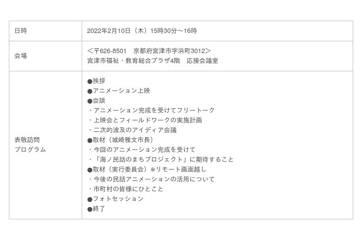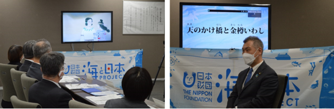 一般社団法人日本昔ばなし協会は、日本中に残された海にまつわる民話を発掘し、その民話のストーリーとその民話に込められた「想い」「警鐘」「教訓」を、親しみやすいアニメーションとして映像化しました。2月10日(木)宮津市福祉・教育総合プラザにて京都府宮津市を舞台に制作されたアニメ『「天のかけ橋」と 「金樽いわし」』の完成報告を実施いたしました。