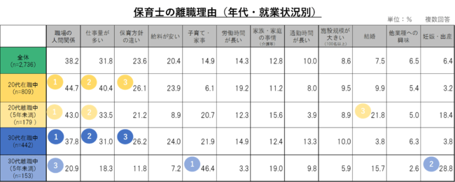 ●保育士の離職理由となるのは、「職場の人間関係」(38.2%)が最も多く、次いで「仕事量が多い」(31.8%)、「保育方針の違い」(23.6%)が続くが、年齢や就業状況を分類して比較するとライフイベントの影響が大きくなる