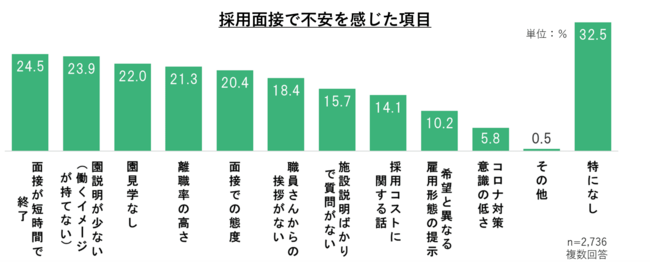 ・「面接が短時間で終了」「園説明が少ない」「園見学なし」などが上位となり、施設の状況が十分にわからない状態に不安を感じる人が多い