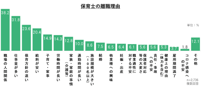 ・保育士が離職の理由として多く挙げたのは、「職場の人間関係」(38.2%)が最も多く、「仕事量が多い」