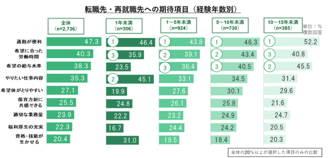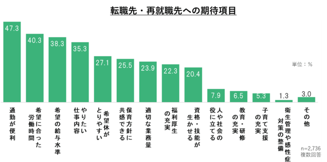 次の職場に期待することは「通勤が便利」(47.3%)が最も多く、「希望に合った労働時間」(40.3%)、「希望の給与水準」(38.3%)が続く