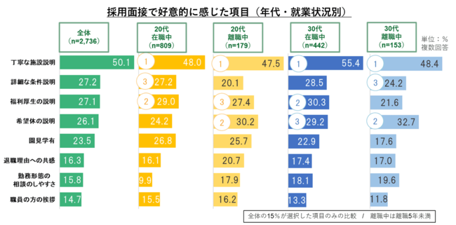 ・「丁寧な施設説明」がいずれの年代・就業状況においても最も好意的に捉えられている