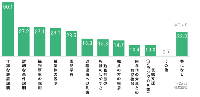 ・「丁寧な施設説明」を半数以上(50.1%)が選択し、当該施設で働くイメージが持てるような説明の重要さが表れている