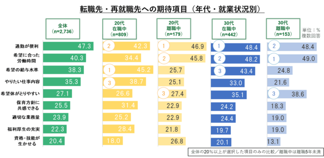 ・離職中の方は、通勤・労働時間・休暇等のライフスタイルと連動する項目の選択割合が高い