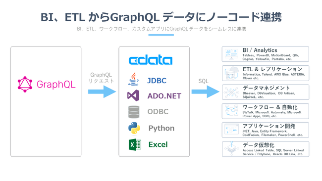 GraphQL を採用するサービスは増加していますが、GraphQL の利用には一般的なWeb API と同様にプログラミングが必要です。また、GraphQL は新しい技術であるため、業務で広く活用されているBI、ETL ツール、ローコードプラットフォームでは、まだ連携コネクタが提供されていない状況です。今般リリースされる『CData Drivers for GraphQL』は、企業ユーザーが使い慣れているあらゆるツールからGraphQL へのノーコードでの連携を可能にします。GraphQL のような新しい技術を取り入れたサービスを採用しても、既存の仕組みを大幅に変えることなく、データ活用を推し進めることができます。