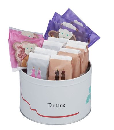 一口サイズのタルトやくま型もなかにチョコクリームを流した二コルなど、人気の味を限定缶に詰め合わせて。