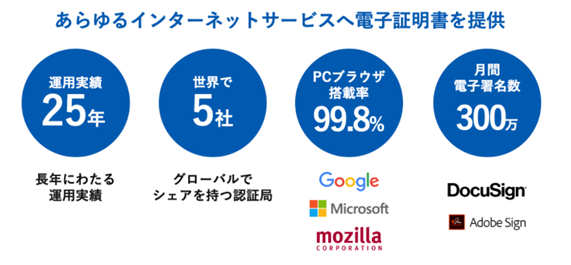GMOグローバルサイン・HDとは、11万社の法人のサーバー運用実績、国内販売代理店 約6,700社の販売代理店を有するホスティング事業者であり、世界で5社しかないグローバルでシェアを持つ電子認証局の中で唯一の国産認証局「GlobalSign」を保有する老舗IT企業です。政府関連機関・大手企業をはじめ世界各国の企業・団体に電子証明書を導入しています。