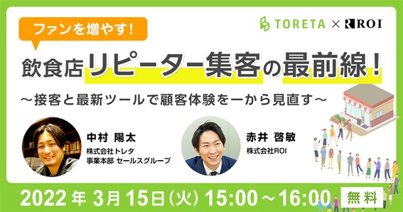 国内最大級の顧客満足度向上プラットフォーム「ファンくる」を運営する株式会ROI(本社:東京都千代田区、代表取締役社長:山口敬人)は、株式会社トレタ(本社:東京都品川区、代表取締役 CEO:中村仁)と飲食店応援セミナー「ファンを増やす! 飲食店リピーター集客の最前線!~接客と最新ツールで顧客体験を一から見直す~」(定員:80名/無料)を3月15日(火)に共催いたします。(申し込み先:https://biz.fancrew.jp/seminar_contact2?=pr1)