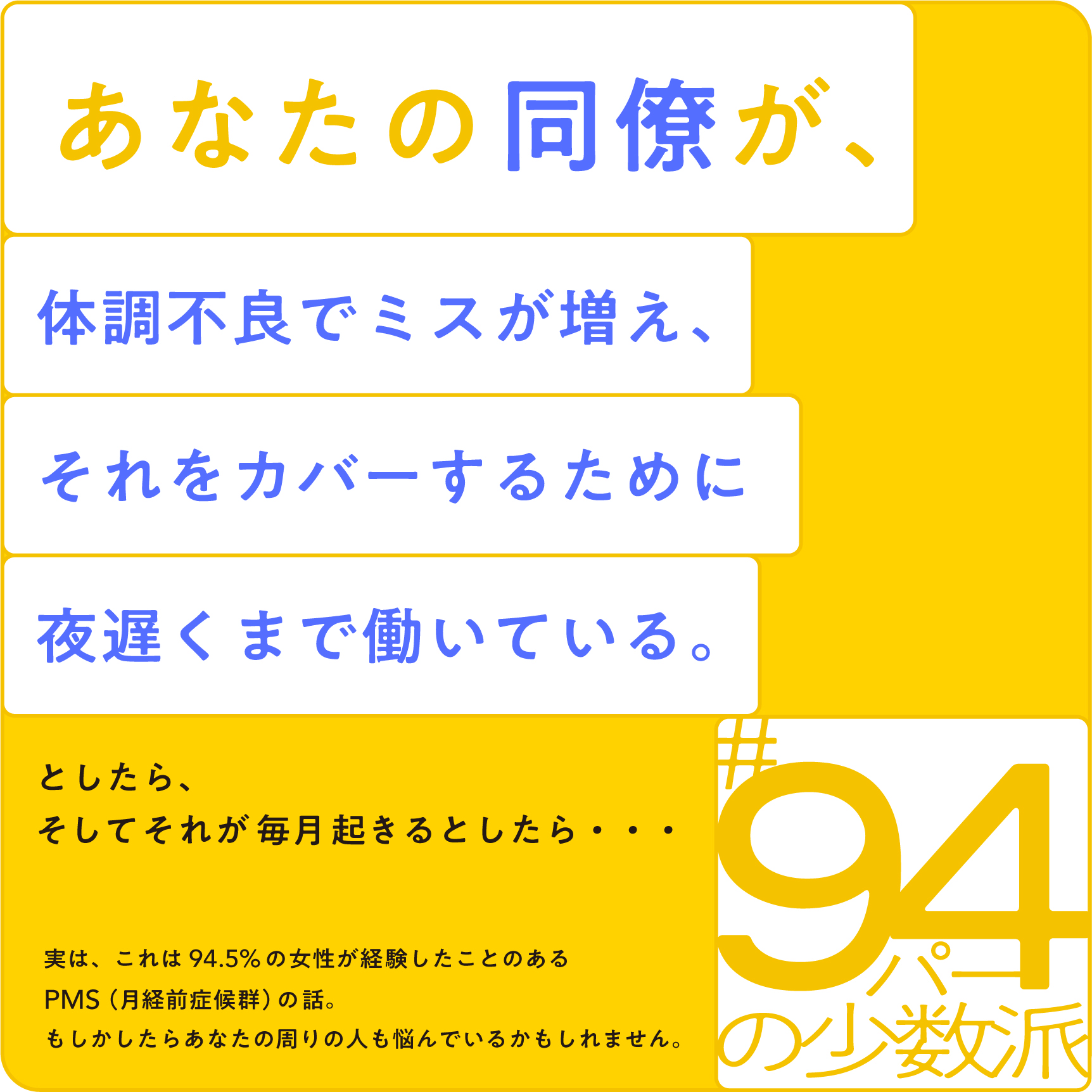 キーワードである「#94パーの少数派」「#PMSをもっと知ってほしい」には、PMSを感じたことのある女性は94.5%と大多数のはずなのに、PMSの理解が進まず多くの女性が一人で苦しみを抱えている状況を、まずは一人ひとりが知ることから変えてみませんか、というメッセージを込めました。