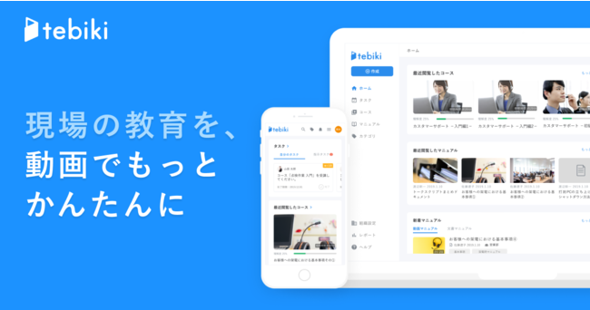 tebikiは、小売/サービス/製造/物流/介護/飲食などの、デスクを持たない社員(デスクレスワーカー)が働く「現場」向けクラウド型動画教育プラットフォームです。