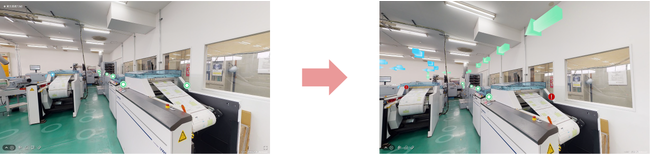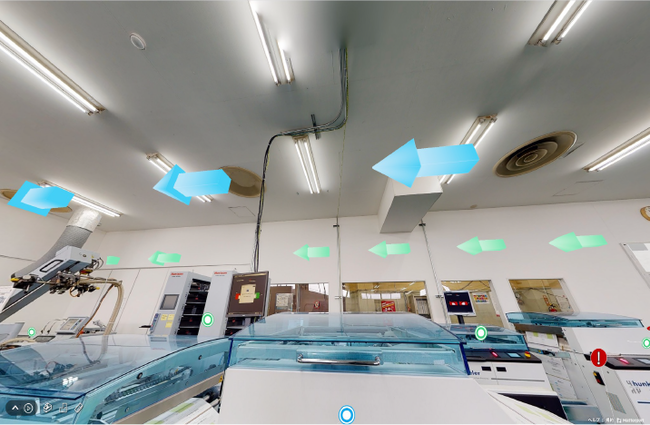 →3DCGで表現された矢印をVR空間内に配置することで、初見の人にも製造ルートが伝わりや すいよう工夫をしました。