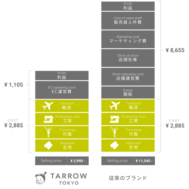 『TARROW TOKYO』は、品質よりも価格を重視した「売るための服作り」に主眼が置かれている状況を打破し、一人ひとりが必要な服を長く大切に着る世界を作りたいという想いから誕生したブランドです。