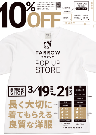 繊維製品の製造販売(アパレルOEM)を行う株式会社グラックジャパン(本社:名古屋市中区、以下:グラックジャパン)が立ち上げた新ブランド『TARROW TOKYO(タロウ トウキョウ、以下:タロウ)』は、初の体験型POPUPショップを2022年3月19日(土)~3月21日(月・祝)、東京都港区北青山で開催します。