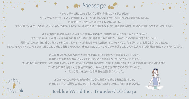 Iceblue World一同、皆さんと一緒に、小さなやさしさの波が、大波になっていく旅にこれから出かけられること、とっても楽しみにしています♥