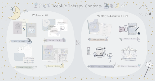 ご入会いただくと、Iceblue Therapy Special Welcome Kitのほか、毎月Iceblue Therapy NoteとTherapy Item - Moon Milk -、Therapy Event Ticketが届き、毎日の自分の心の中にきらきらしたやさしい拠り所を作れます。