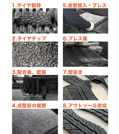 タイヤを粉砕してチップ状にしてから、アウトソールに最適な配合で板状に加工します。金型に投入してプレス後、型抜きしてアウトソールが完成します。