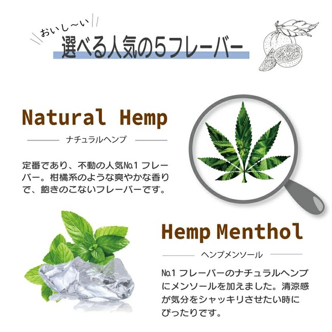 ヘンプ本来の風味を引き立てる5種類のフレーバーをご用意しております。