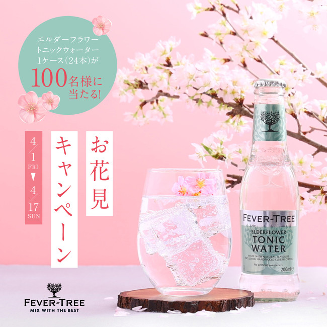 お花見シーズンを記念して、エルダーフラワートニックウォーターを存分に楽しめる1ケース(24本)を100名様分ご用意。この機会にフィーバーツリーで作るドリンクをぜひお試しください。