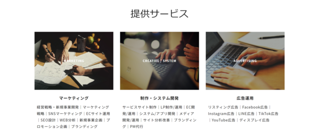事業内容:マーケティング事業、広告代理店事業、Web制作事業、システム開発事業、動画クリエイティブ制作事業、外食事業