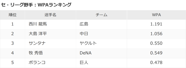 初回のセ・リーグ野手編では、劇的な逆転サヨナラ打を放った西川(広島)、2度にわたる同点打でチームのサヨナラ勝利に貢献した大島(中日)が上位に。その他3項目は特集でお楽しみください。