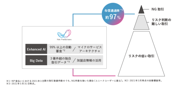 業界最大手である当社は、後払い決済で最も重要な指標である"与信力"に定評があります。後払い決済は、与信審査を厳しくしすぎると事業者様の売上向上メリットが少なくなりますが、緩くしすぎると不正取引を検知できず、未回収率のコントロールが難しくなりサービス品質の維持が難しくほか、商品の転売等によるブランド毀損をマーチャント様に引き起こします。