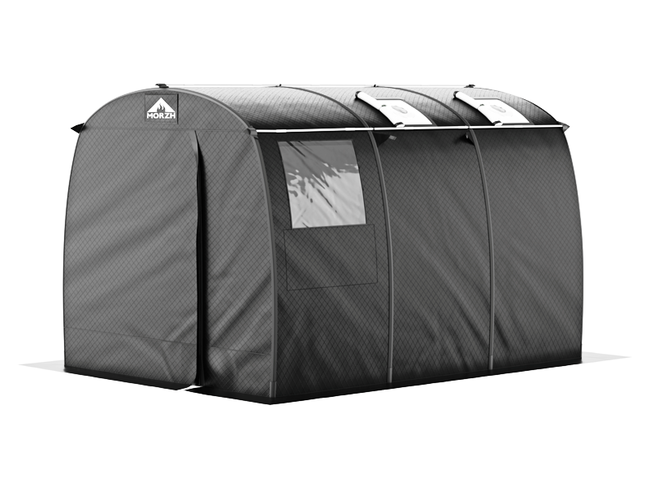 断熱性の高い3層式のテント。大きな窓からは、晴れていれば陽の光がテント内に差し込み、夜は夜景を眺めながらサウナをお楽しみいただけます。少人数でご利用いただけるテントサイズです。